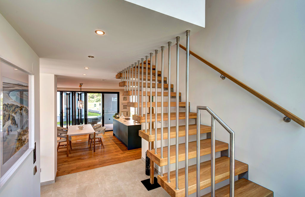 Bereits von außen fällt die großzügige Eingangs- und Terrassenüberdachung auf, die auch bei Regen ein trockenes Heimkommen bzw. Entspannen im Freien ermöglicht. Besonders beeindruckend ist die zweigeschoßige Glasfront, die zusätzlichen Raum schafft, mehr Licht ins Innere lässt und einen traumhaften Ausblick ermöglicht. Ein weitere innovative Lösung wird mit der extrabreiten Glas-Faltwand mit einer Größe von 5,60 x 2,46m geboten – ideal für einen fließenden Übergang von Drinnen nach Draußen. Ein absolutes Highlight stellt die in die Küche integrierte kompakte Technikbox dar, wodurch kein eigener Technikraum nötig ist und man zusätzlichen Wohnraum gewinnt. Die funktionale Wohntreppe bietet praktischen Stauraum sowie Platz zum Spielen und kann auch als Fensterbank genutzt werden.
