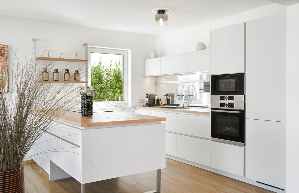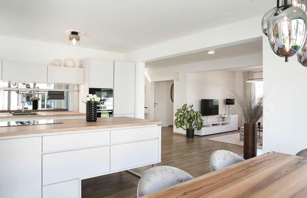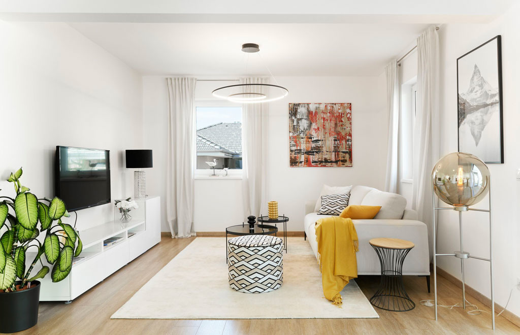 Das Genera 150 von Haas liegt genau im Trend: Dieses Musterhaus zeichnet sich durch klare Linienführung, Flachdach und angeschlossenen Carport aus. Großzügiges und luftiges Wohnen bietet das Erdgeschoß, wo im Erker ein schöner Essplatz integriert ist. Ein weiteres Zimmer auf der gleichen Ebene sowie ein kleines Duschbad ist ideal für Gäste, kann natürlich auch als Arbeitszimmer genutzt werden. Im Obergeschoß sind drei Schlafzimmer (eines davon mit Schrankraum und Terrasse), das Familienbad und ein getrenntes WC untergebracht.