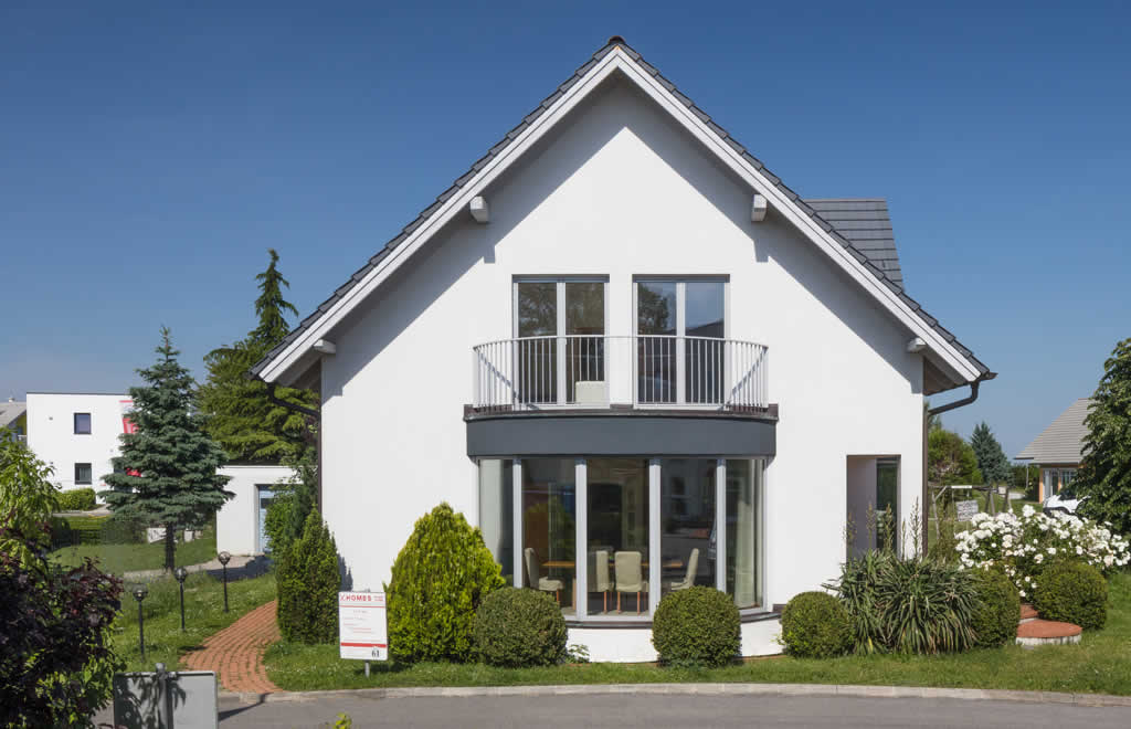 Das Musterhaus La Casa von X.HOMES besticht nicht nur durch sein repräsentatives Äußeres, sondern auch durch das perfekt geplante Innenleben. Die beiden Runderker lassen extrem viel Licht und Sonne ins Haus. Das großzügig angelegte Wohnzimmer ist mit der integrierten Küche das Zentrum des Geschehens, ein zusätzliches Zimmer auf dieser Ebene ergänzt das Raumprogramm. Im Obergeschoß ist mit drei Schlafzimmern und der Möglichkeit von zwei Bädern ausreichend Platz für eine große Familie.