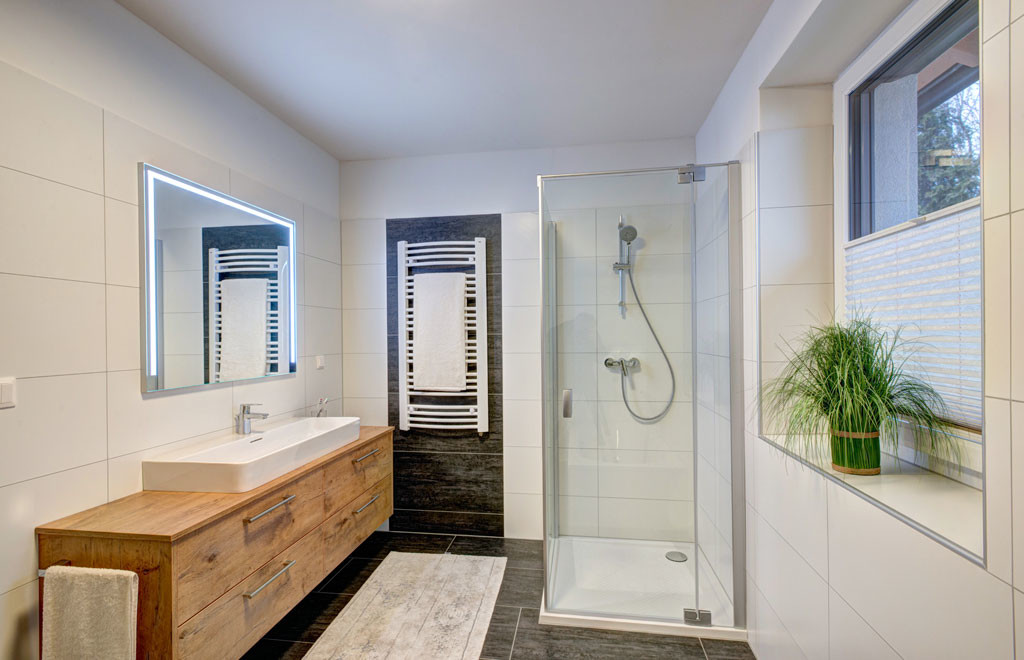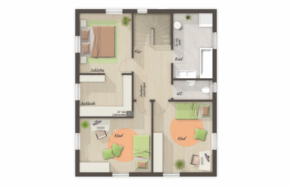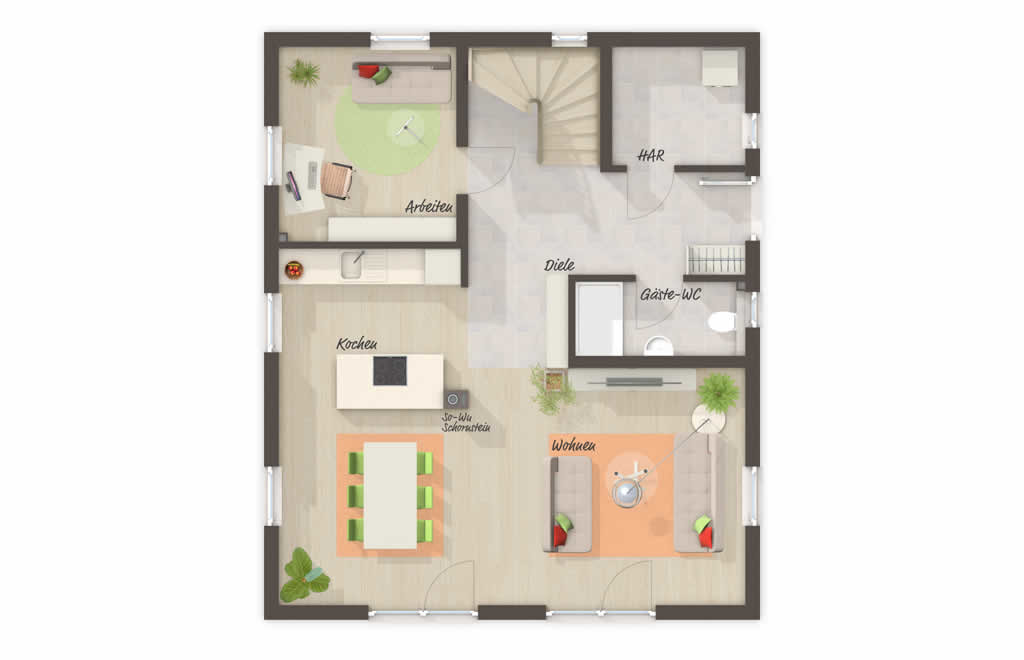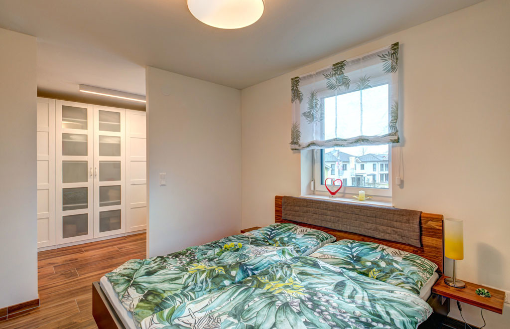 Elegantes Design in Kombination mit einem cleveren Grundriss: Die Stadtvilla 137 Exklusiv zeichnet sich durch ihre perfekte Raumaufteilung aus, beginnend bei der großzügigen Diele mit Treppenaufgang ins Obergeschoß und Zugängen zu allen Räumen im Erdgeschoß. Der geräumige Wohnbereich mit integrierter Küche lässt durch große Fenster und hohe Glastüren viel Licht ins Innere. Auch die drei Schlafräume im Obergeschoß sind durch bodentiefe Fensterelemente sehr hell. Ein im Elternschlafzimmer integrierter Schrankraum, ein großzügiges Bad und ein separates WC runden das Raumprogramm im Obergeschoß perfekt ab. Auf Wunsch ist dieses Haus auch mit Keller erhältlich.
