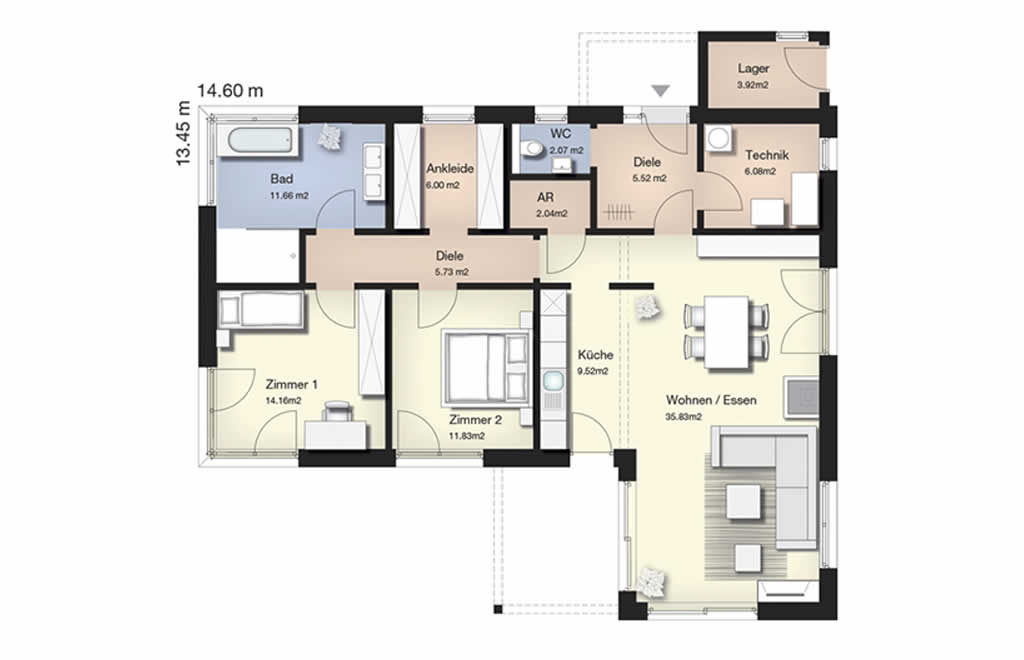 Der Bungalow Terra 110 ist ideal für kleine Grundstücke und überzeugt mit durchdachter Raumaufteilung. Ein großer Wohnraum mit offener Küche, Schlafzimmer, Schrankraum, extra Kinderzimmer oder Büro, Bad mit Dusche und Badewanne, WC und ein eigener Technik- und Hauswirtschaftsraum machen ihn zum perfekten Zuhause.